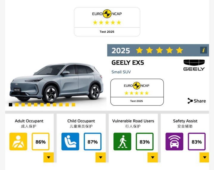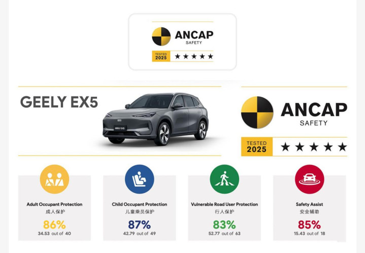 今天,澳洲新车安全评鉴协会公布的最新一批新车碰撞测试评定中,吉利银河E5以145.52的总分,获最高五星安全评级。昨天,全球最权威的欧洲新车安全评鉴协会也公布了2025年新一期安全碰撞测试结果,吉利银河E5(海外版命名:吉利EX5)以145.4的总分获五星安全最高评级,并拿下2025年度欧洲新车安全评鉴协会中国品牌综合成绩第一。